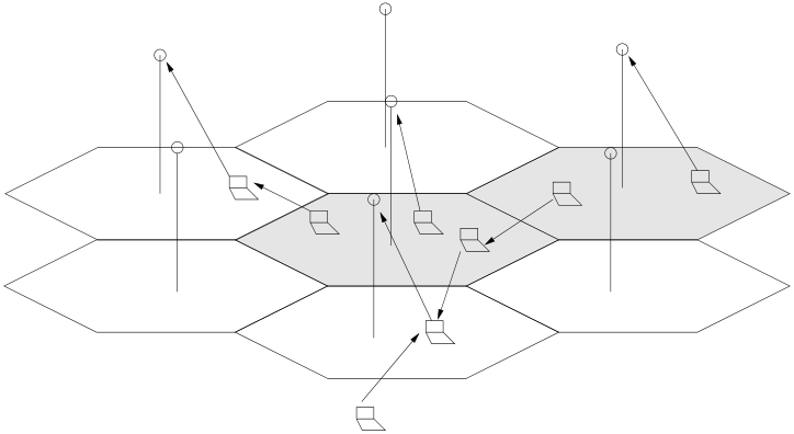 and positions. With the help of GPS technology [25], it is possible for the cellular network to know the precise po-sition for each mobile host. In case GPS is not available, by the cellular position technology, the base station at least knows which section of a cell a mobile host resides in. With the knowledge of precise positions or sections of each mo-bile host, the base station of the hot cell can select proper agents for its MADF users. More than one agent will be se-lected, since the connectivity between the mobile host and the best agent selected by the base station may actually do not exist (e.g., due to the complex radio propagation envi-ronment). Mobile host determine which agent to be used referring to its local connectivity. Redundant agents may also be useful for routing robustness. When an agent in MADF suddenly cannot function well because it switches off or makes a large move, the host can forward data to another agent while it sends a report of the routing failure to the base station. Compared to the normal ad hoc rout-ing protocols, the routing in MADF is simpler and more efficient since it excludes the complicated routing discovery procedures for most ad hoc routing protocols.