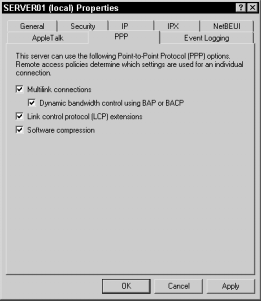 You can configure several PPP settings on the PPP tab in a Windows 2000 remote access server’s Properties dialog box. Figure 17-8 shows the PPP tab. Notice that all of the options in this dialog box are selected by default.